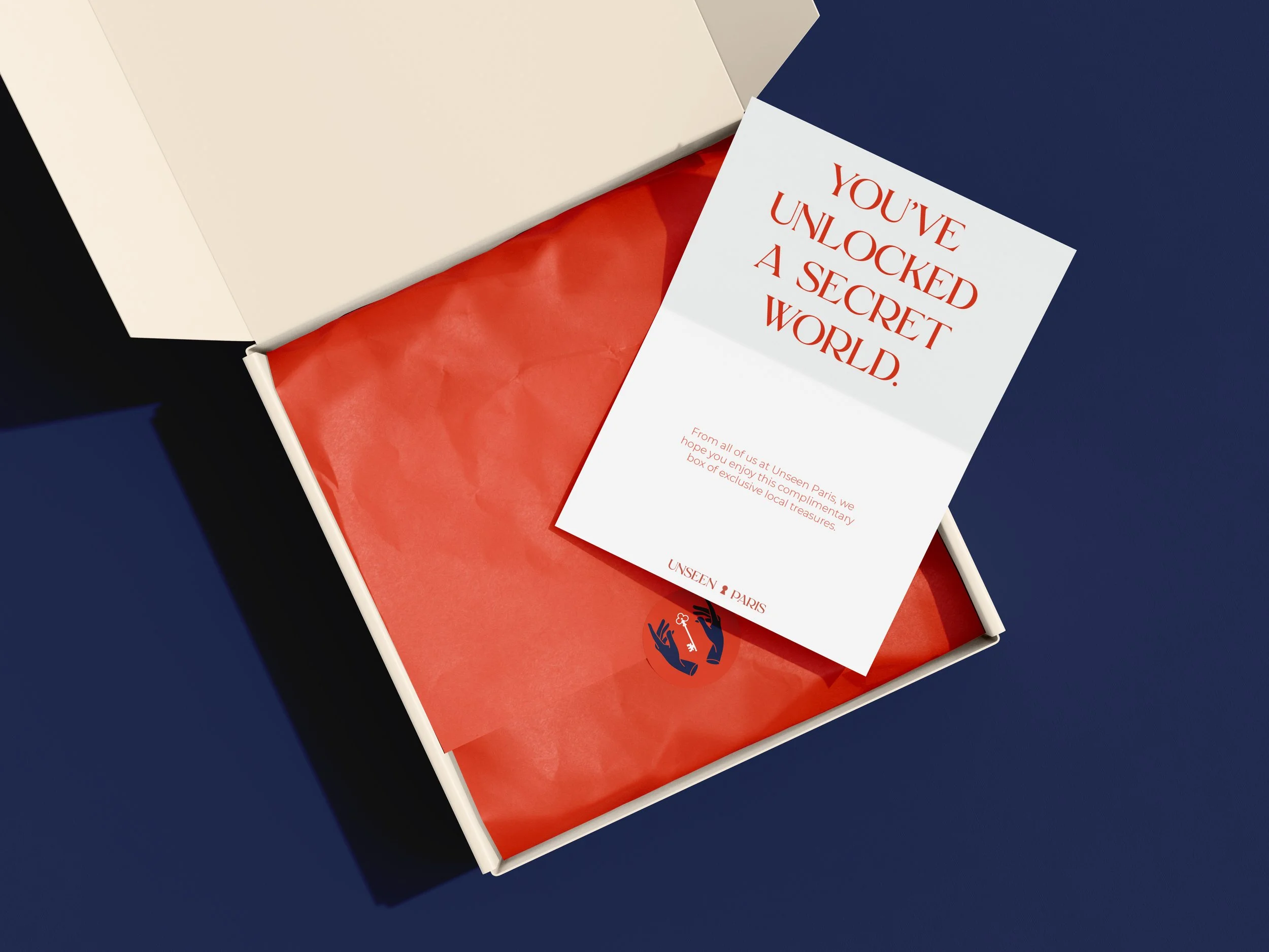Custom boutique package designs for exclusive tours, events, and day trips, filled with local, unique treasures from partnered businesses, bring Unseen Paris home, adding extra touchpoints for the brand.